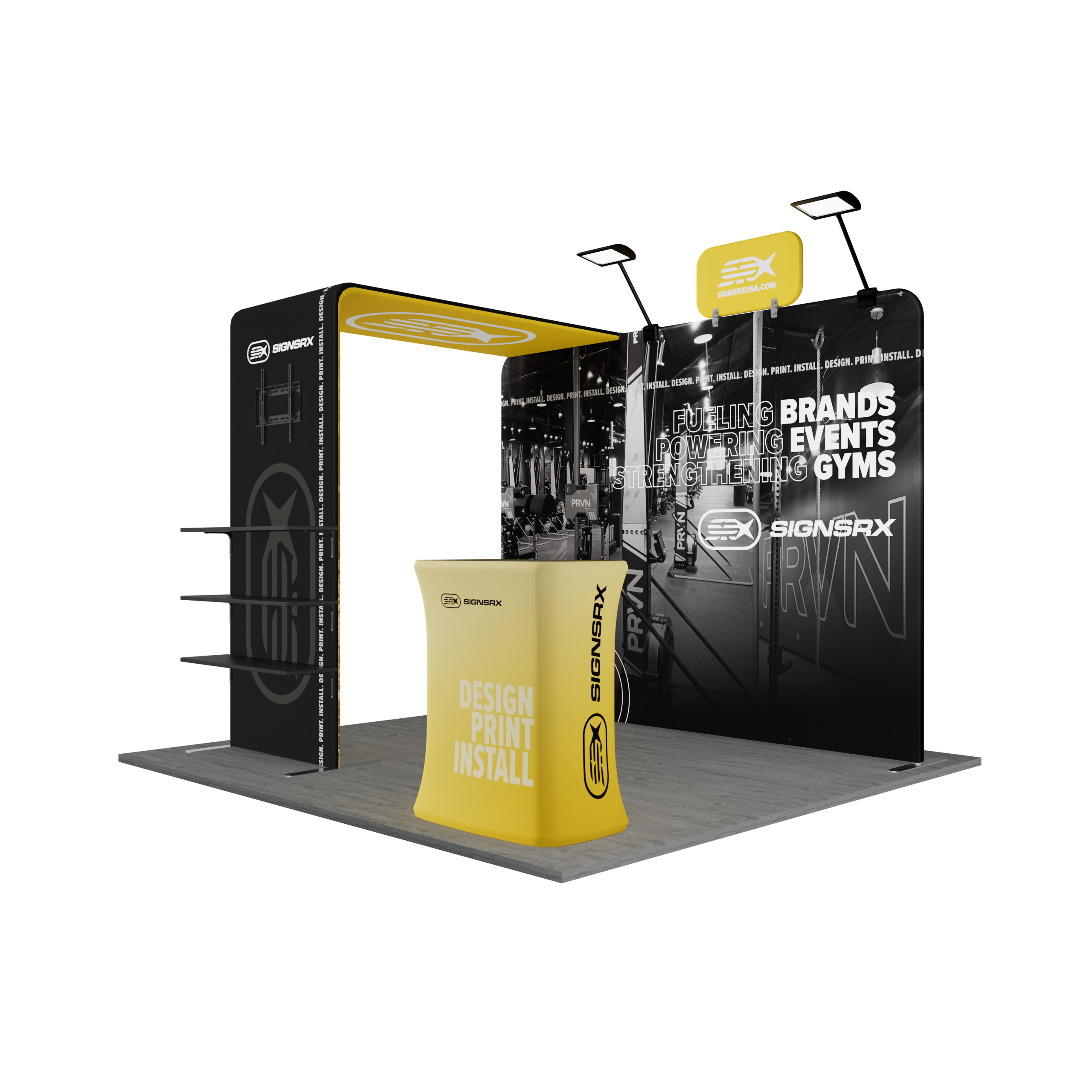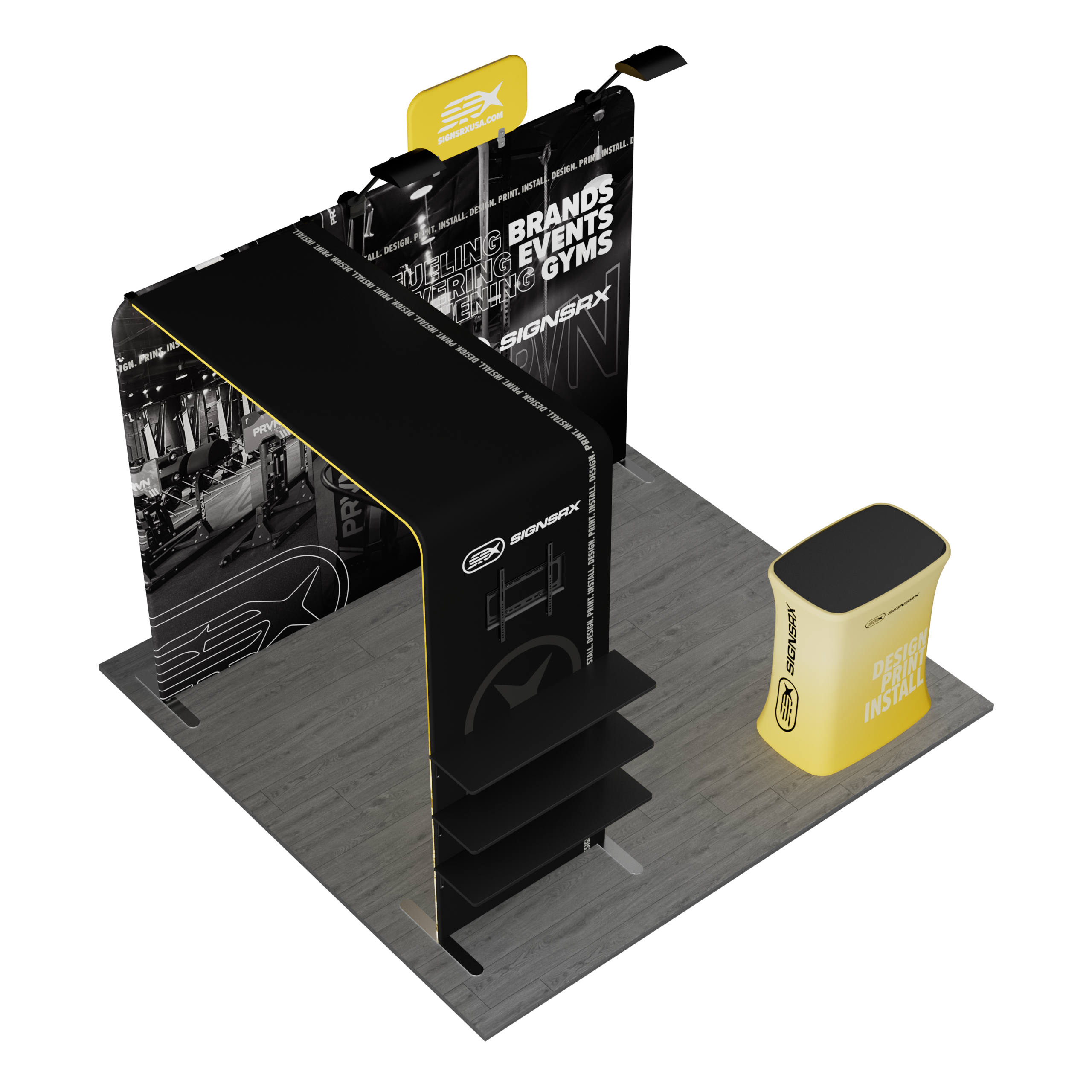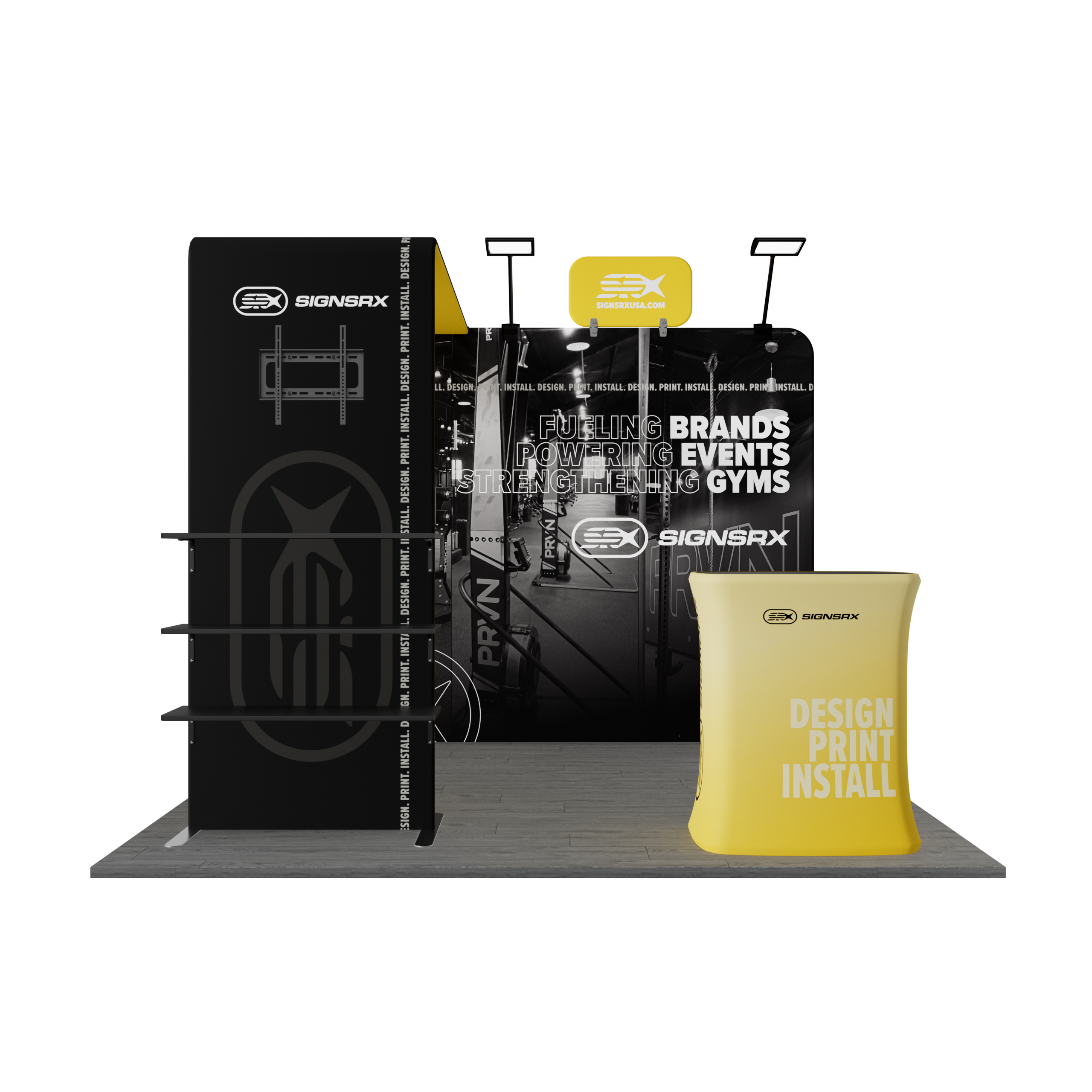 - Multimedia-Ready: Includes TV mount, shelving, header, and counter for interactive brand engagement