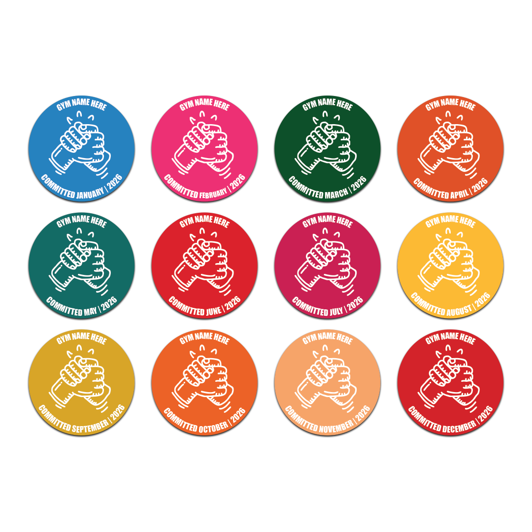 Committed Club Stickers are the perfect way to celebrate your membersโ€™ hard work and keep them motivated month after month. Designed to reward consistency and strengthen community engagement, these stickers turn attendance milestones into something members can wear with pride. Printed on durable vinyl with a smooth matte laminate, each sticker is die-cut with a clean border for a polished look that stands out on water bottles, notebooks, or gym gear.